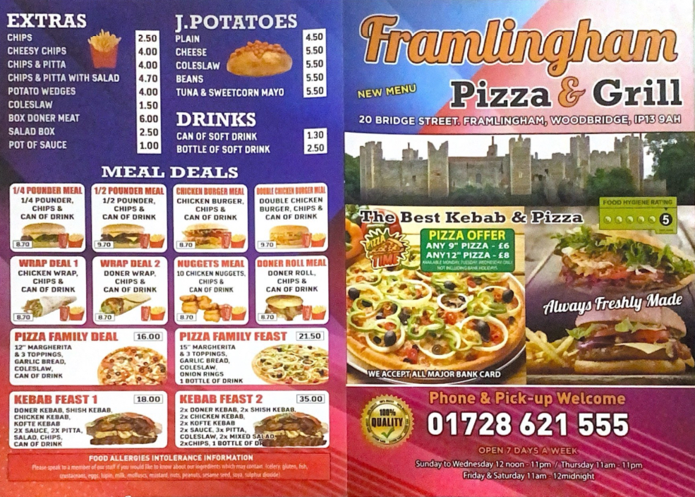 The menu at Framlingham Pizza & Grill offers a straightforward selection of casual, satisfying dishes, ideal for a quick meal or a relaxed takeaway. Whether you're stopping by for a comforting burger, a fresh wrap, or a hearty pizza, the choices are designed to meet the needs of those seeking simple, familiar flavors made with care.